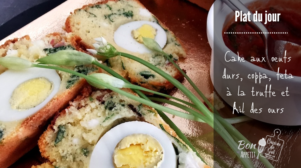 Cake aux oeufs durs, coppa, feta à la truffe et ail des ours