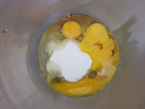- Dans le bol du cooking, ou d’un saladier battre les oeufs et le sucre jusqu’à ce que la préparation blanchisse