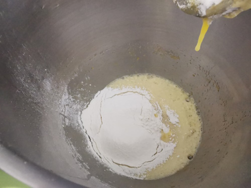 - Incorporer petit à petit la farine tamisée et bien mélanger à l’aide de la feuille, vitesse 3/4.