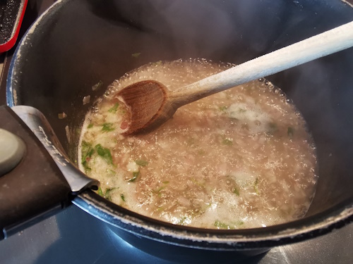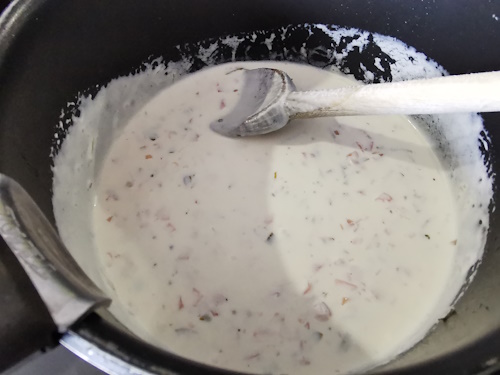 - Lorsqu’il reste que la moitié du liquide, ajouter la crème et baisser le feu immédiatement.