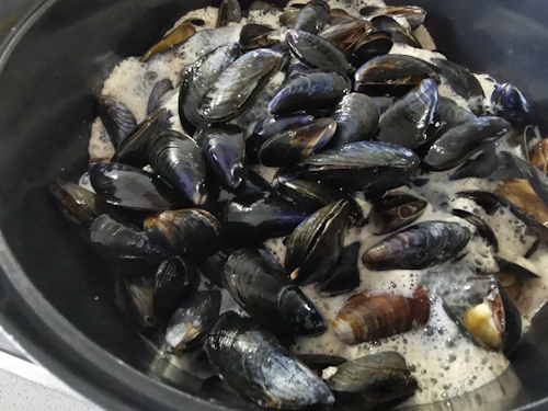 - Mettre le faitout contenant les moules sur le feu et verser le reste vin blanc. Couvrir