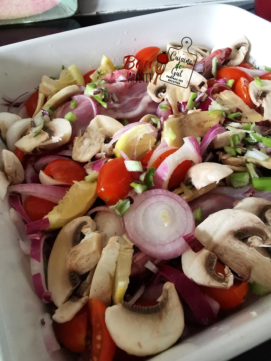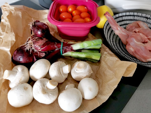 Tiens tiens, voilà qui pourrait faire mon plat pour demain me suis-je dit ?J’ai donc regardé ce que j’avais dans mon frigo pour savoir si cela était possible. J’avais à peu près ce qu’il fallait mais je n’avais pas suffisamment de tomates cerises. Du coup pour que l’on ai suffisamment de légumes, j’y ai ajouté des champignons. J’ai aussi modifié le temps de cuisson car j’aime le lapin bien cuit.