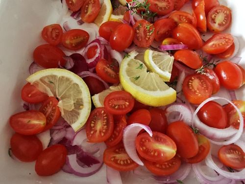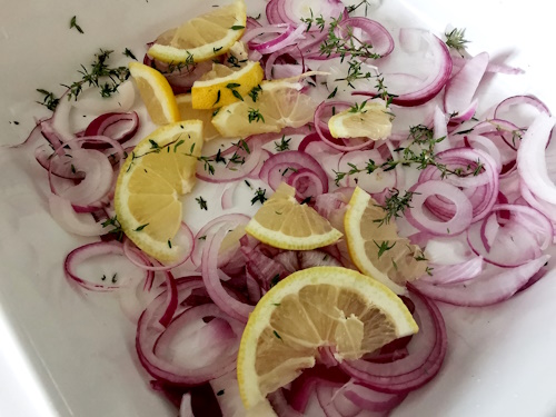 • Dans un plat allant au four ajouter les oignons, le thym et les citrons
