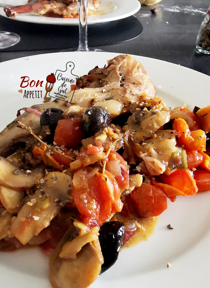 Bonjour !! Comme vous le savez sans doute vu que je le répète souvent, je déteste le poulet, mais ceci ne m’empêche pas de m’arrêter sur certains plats et parfois, je me sers d’une recette pour la revisiter. C’est ce que j’ai fait en voyant le poulet aux tomates cerises, citron et olives de mon amie Martine (Kilomètre-0). Dans ma tête je l’ai immédiatement transformée avec des gigolettes de lapin.