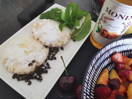 Bonjour !! Comme vous le savez je fais peu de desserts, tout du moins des gâteaux surtout maintenant, mais j’aime bien de temps à autre en faire un avec des fruits. Ce jour là, j’avais un reste d’une bombe de crème fouettée que je voulais utiliser et des petits Amaretti que mon mari venait d’acheter au marché (ils sont faits maison et tout frais). J’ai donc réalisé ce petit dessert sans prétention, avec les fruits que m’avait ramené mon mari du marché.