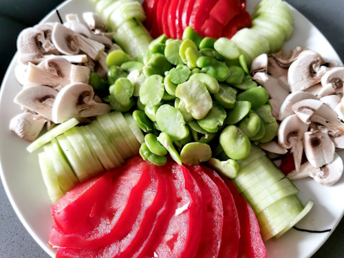 - Eplucher les champignons, les tailler en lamelles et les placer entre les concombres.