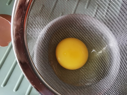 - Casser un oeuf dans une passoire placer au dessus d’un petit bol