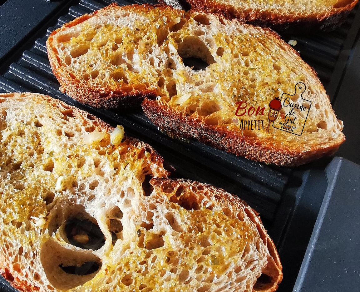 2- Choisir de bons ingrédients de qualité, même l’huile d’olive ! Si vous n’avez pas de plancha ni de grill, alors faire griller les tranches au grill pain ou sous le grill du four !