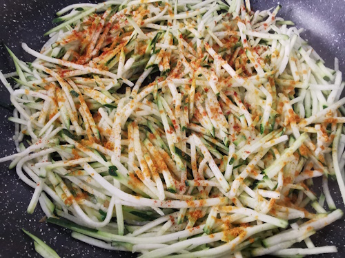 - Ajouter un peu de vinaigrette sur les courgettes.