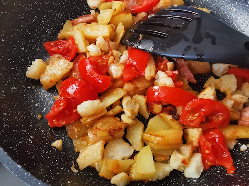 - Couper le chou fleur en tous petits bouts et les ajouter aux pommes de terre.