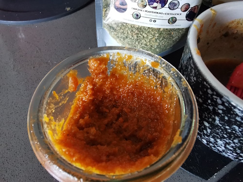- Mélanger de l’huile d’olive avec une belle cuillère à soupe de Pesto Rosso et des épices Chimichurri dans un ramequin. Bien mélanger le tout