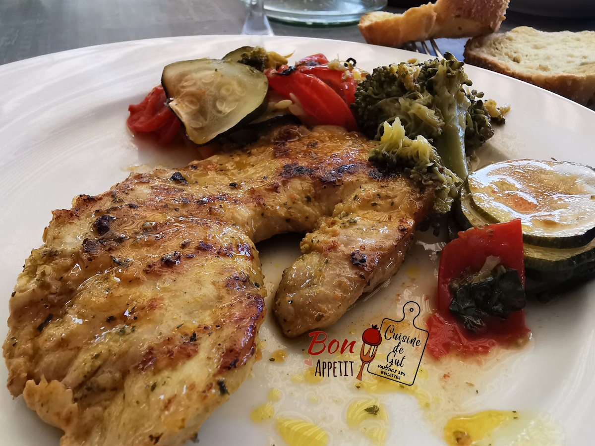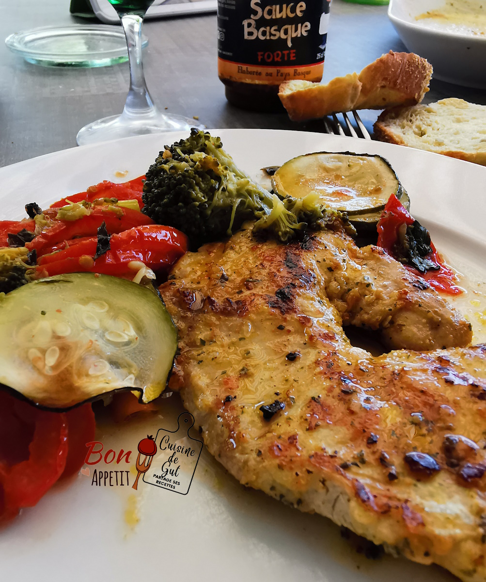 Ensuite, j’ai fait un mélange avec de l’huile d’olive, ces épices et du pesto rosso que j’achète chez Grand Frais car il sent bien le parmesan. J’ai ensuite badigeonné ma viande avec ce petit mélange et l’ai laissée reposer tranquillement 2 heures. Pour accompagner ce bon morceau, j’ai fait simple. Il me restait du Tian de courgettes, tomates, poivrons et mozza au basilic, un classique estival, j’ai ajouté le reste de brocolis/tomates que j’avais et voilà mon accompagnement était vite prêt !