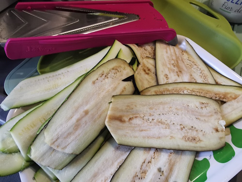 - Couper une demi-aubergine avec la mandoline dans la longueur