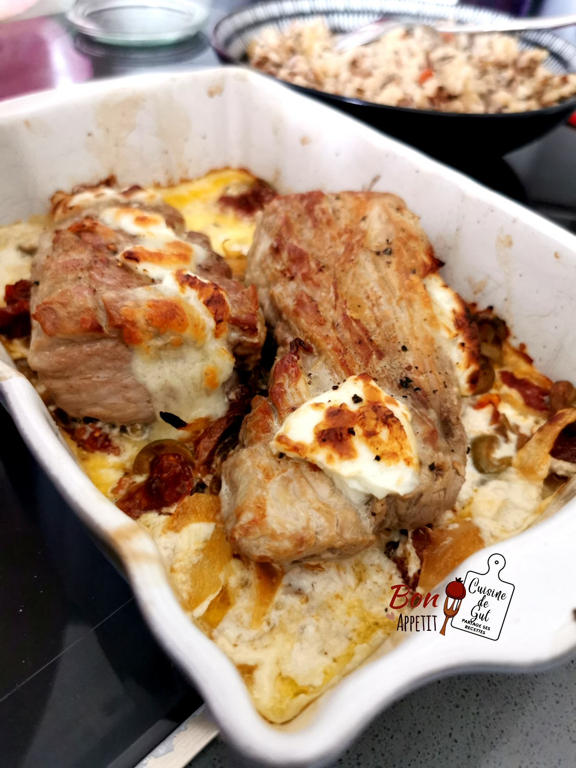 - Mettre dans le fond du plat, la moitié des oignons/ail/olives et tomates séchées et placer le filet mignon sur le dessus