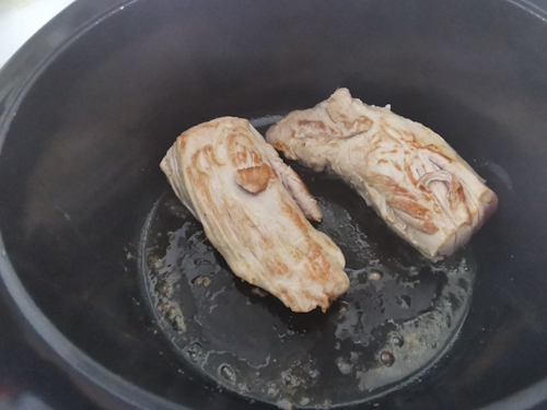 - Dans la même cocotte, ajouter un mince filet d’huile et faire revenir les deux morceaux de filets mignon jusqu’à ce qu’ils soient dorés