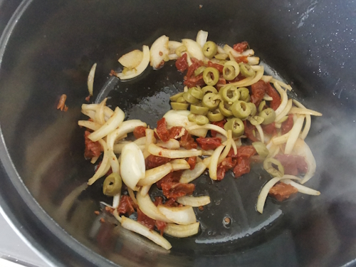 - Une fois cuit, le passer puis ajouter le reste des oignons/ail/olives et tomates séchées