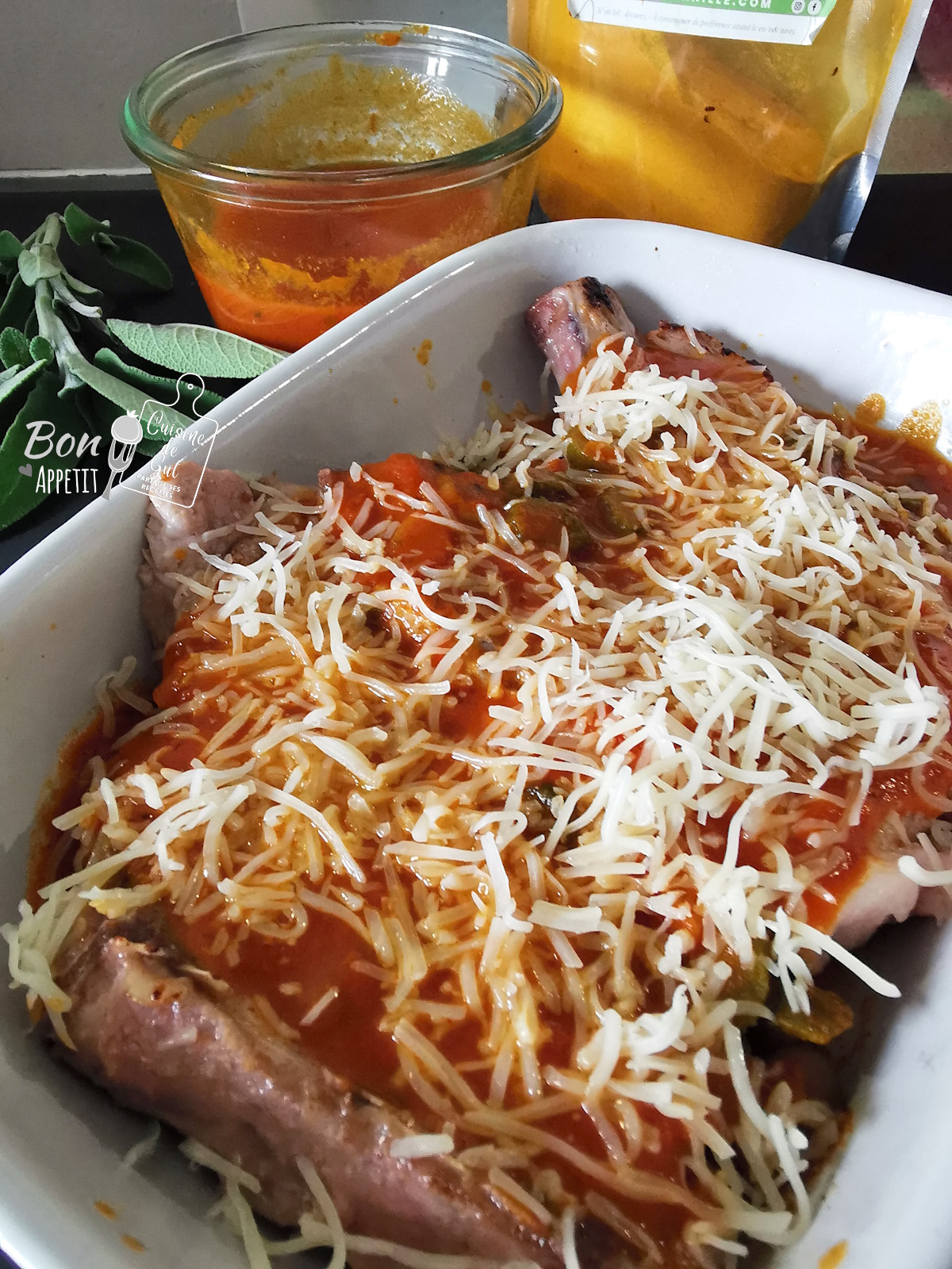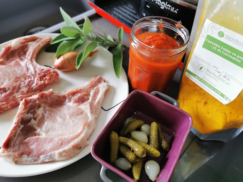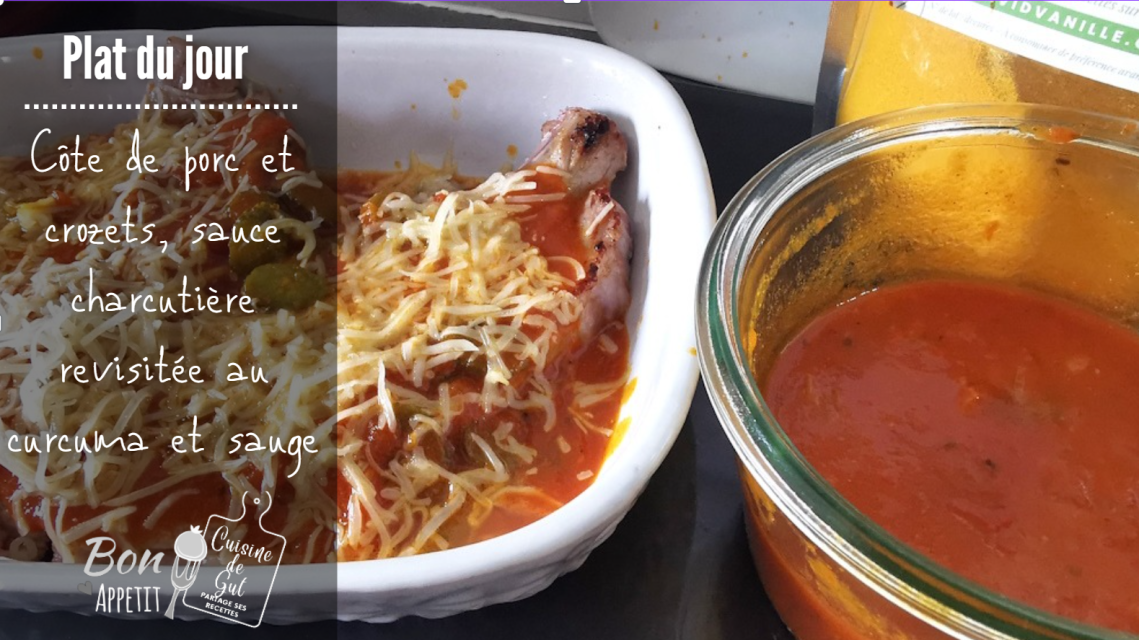Pour le CMUM, j’ai quelque peu revisité la sauce charcutière puisque j’y ai ajouté en plus des cornichons, du curcuma et de la sauge. J’ai aussi fait cuire mes côtes de porc au four contrairement à d’habitude, en y ajoutant du comté râpé. Ce sont les fameuses côtes de Porc de mon amie Delphine, qui m’en ont donné l’idée, car ses côtes de porc au vin blanc et oignons grillés au four c’est quelque chose!
