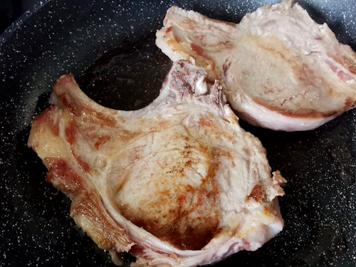- Pendant ce temps là mettre une noix de beurre dans une poêle et faire griller les côtes de porc.