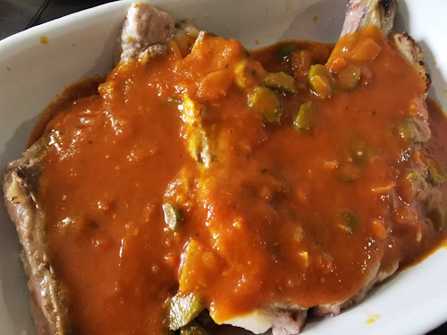 - Lorsque la sauce est cuite, ajouter un peu d’eau pour la désépaissir un peu, et en verser la moitié sur les côtes de porc.