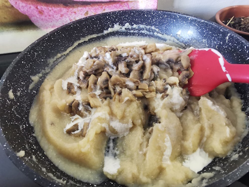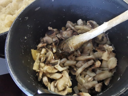 - Une fois les champignons cuits, les ajouter à la purée de céleri dès que celle-ci est entièrement fondue.