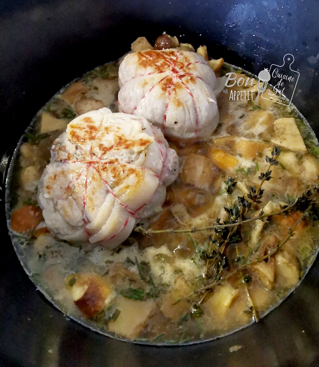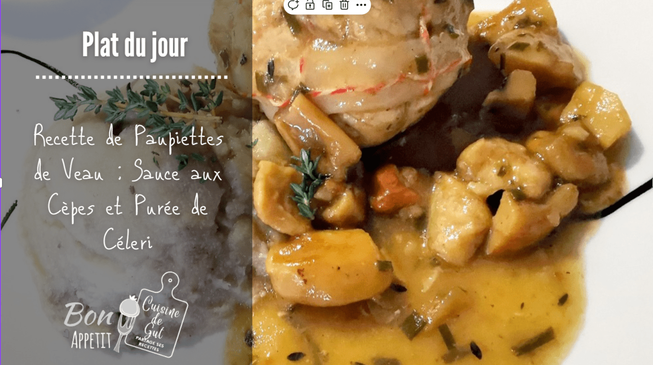 J’avais mon accompagnement avec ma purée de céleri que je comptais mélanger à des champignons de paris que je venais d’acheter, restait à choisir ma viande. Mon choix s’est porté sur des paupiettes de veau. Je savais qu’avec une bonne sauce, comme celles que j’avais faite avec mes Paupiettes de veau aux tomates séchées et champignons sauce au vin rouge, que le régal serait au rendez vous ! C’est morceau de viande qui est assez sec et la sauce est vraiment indispensable pour bien apprécier ce morceau. Voilà un peu en avance un plat que vous pourriez très bien servir aux fêtes croyez moi !
