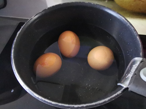 • Commencer par faire cuire les oeufs. Les placer dans de l’eau et les faire cuire à petits bouillons durant 15 minutes.