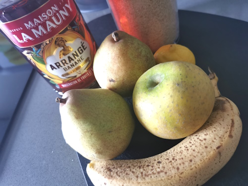 • Couper la banane en rondelles et les poires et pommes en lamelles