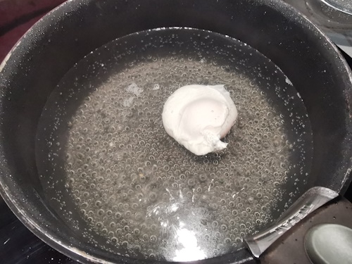 • Au bout de 10 minutes, récupérer les oeufs et les laisser égoutter sur une feuille de sopalin posée sur une assiette.