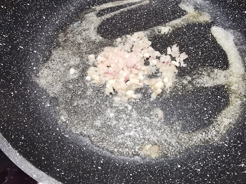 • Mettre une noix de beurre dans une poêle et ajouter le hachis d’échalote et d’ail.