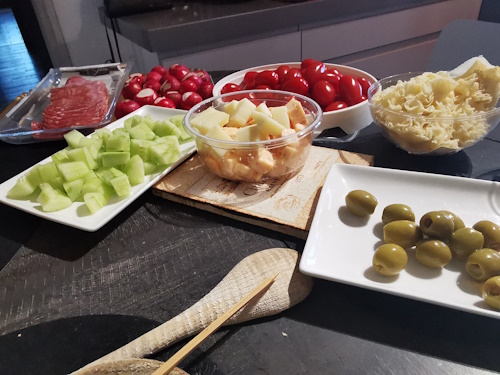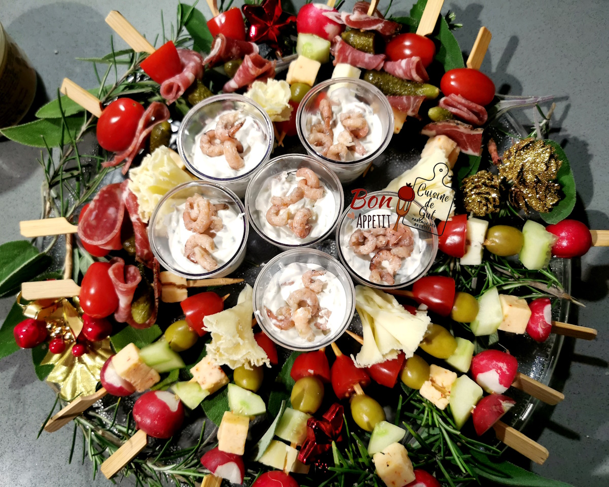 La mienne a été réalisée avec des branches de Romarin et de la Sauge. J’ai choisi de réaliser 2 sortes de brochettes : des brochettes plutôt light et des brochettes autour de la charcuterie donc plus caloriques. A centre j’ai proposé des mini-verrines de fromage frais crémé, citronné assaisonné et avec de la ciboulette dans lesquelles j’ai mélangé des petites crevettes grises. Une assiette de petits feuilletés maison sont venus compléter cet apéro.