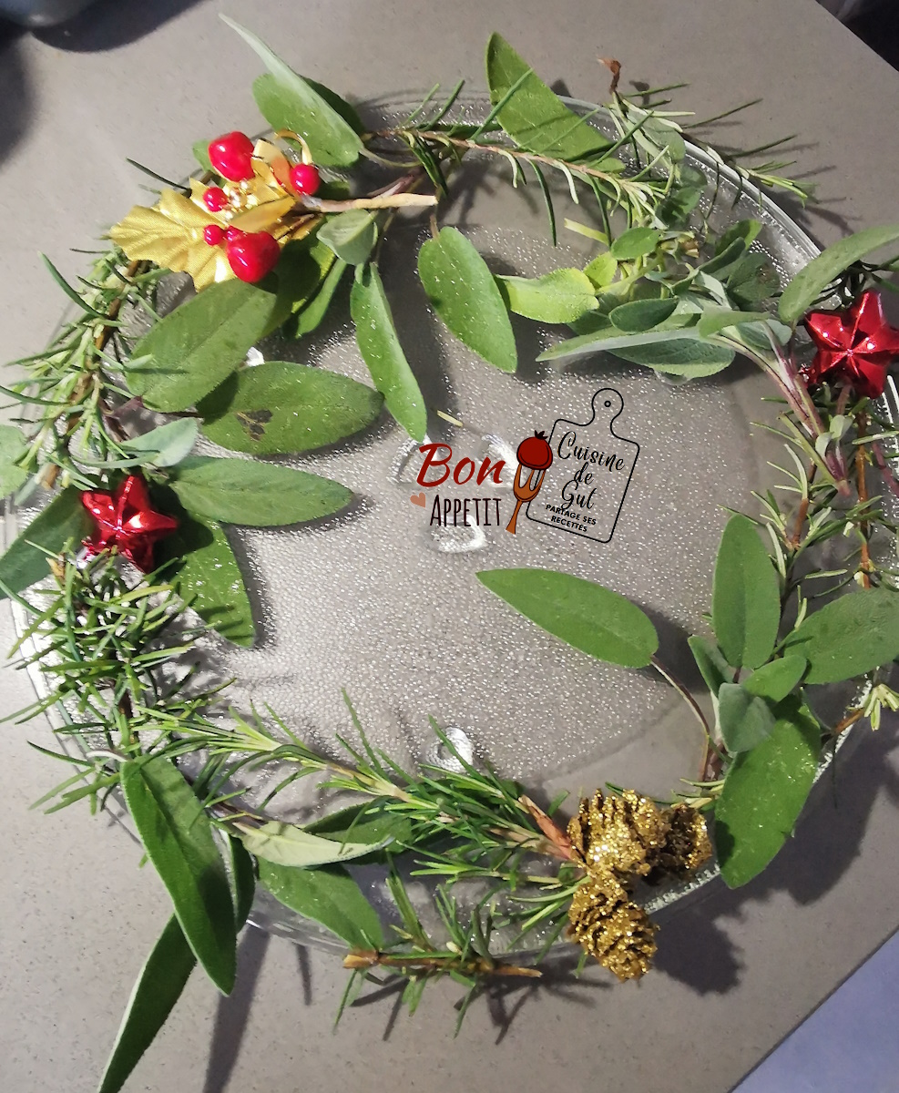 - Commencer par préparer le plat avec les branches de Romarin et sauge qui sont à placer autour d’un plat. Disposer les décorations comme sur la photo