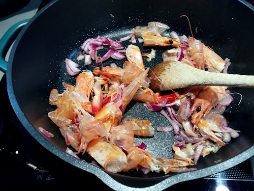 - Faire chauffer à vif les parures de crevette avec l’oignon rouge pendant quelques minutes en appuyant bien sur les têtes des crevettes avec une cuillère en bois