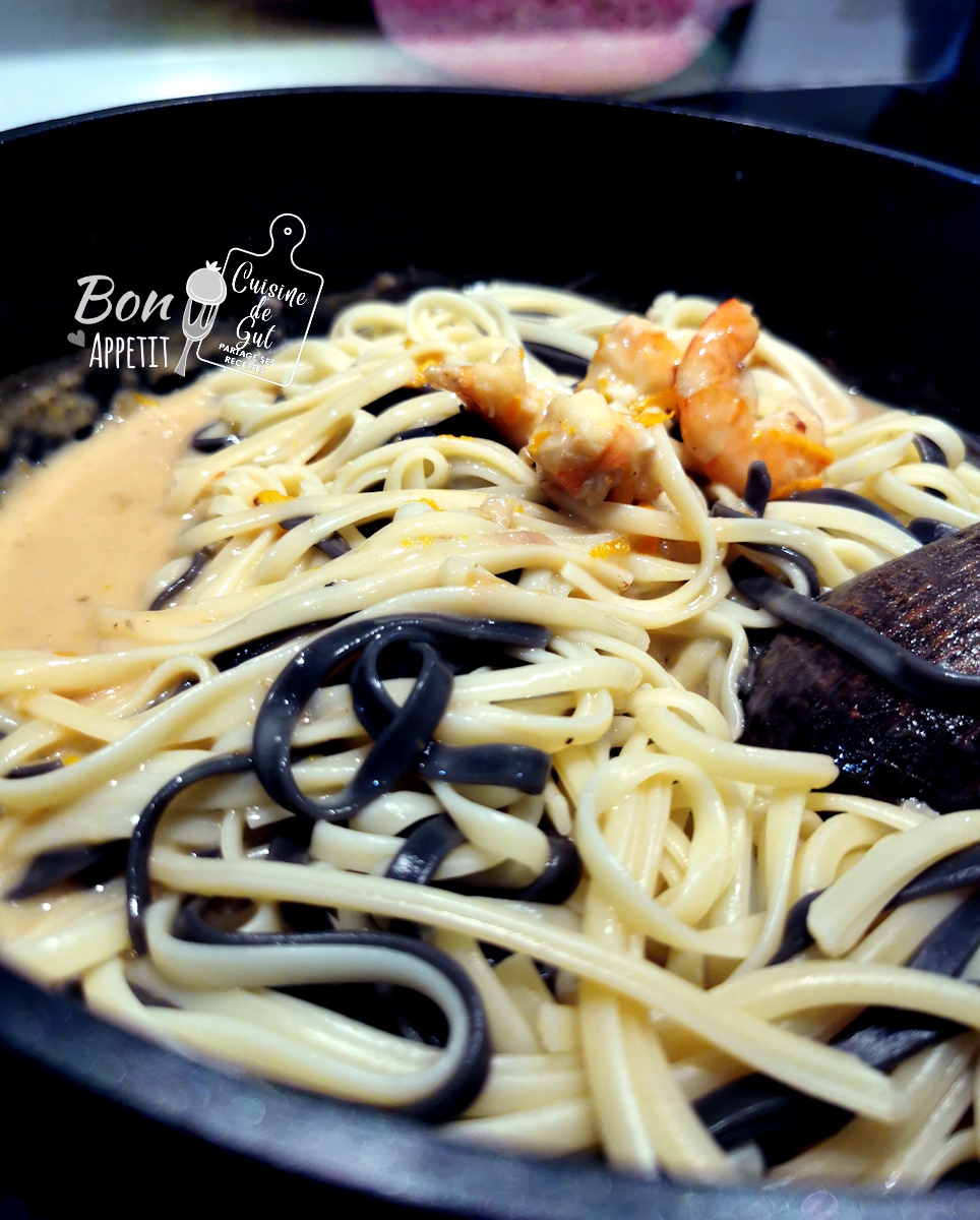 2- J’ai mélangé des pâtes à l’encre de seiche et des pâtes simples mais vous pouvez bien sûr choisir les pâtes que vous voulez