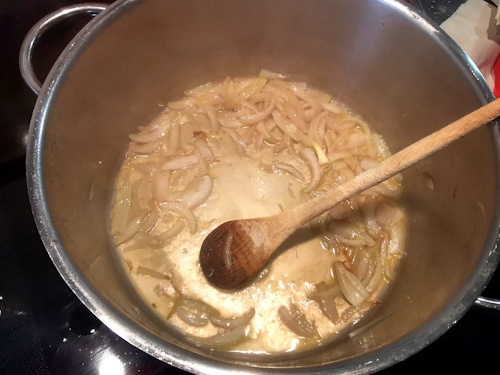 - Mettre de l’huile à chauffer dans un faitout et ajouter l’oignon