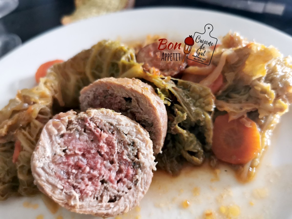 Bonjour !! Dernièrement j’avais acheté un petit chou vert car je voulais faire ma Potée au chou et palette mais au lieu de sortir ma palette du congélateur, j’ai oublié que je voulais la faire le lendemain et j’ai sorti des paupiettes à la place. Mince ! Bon tant pis la palette ce sera pour une autre fois. Au congélo ça ne s’abime pas et puis après avoir fait mes Paupiettes de Veau : Sauce aux Cèpes et Purée de Céleri les paupiettes j’aime ça. J’ai donc voulu les cuisiner avec du chou.