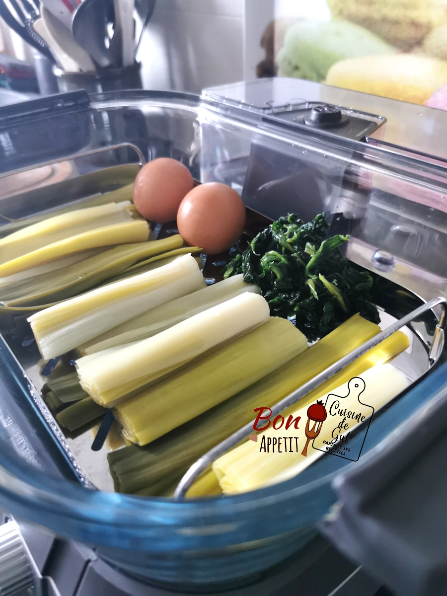 Alors pour débuter j’ai fait très simple : des poireaux vinaigrette mais avec une petite vinaigrette aux épinards. C’est une idée que j’ai reprise de la recette du chef Perla Servan Schreiber, que j’avais vue en sur un tuto. Je dis inspirée car je l’ai modifiée vu que je n’avais pas tous les ingrédients. J’y ai ajouté des oeufs durs cuits également à la vapeur. J’ai aussi décongelé au préalable mes épinards (comme préconisé sur la notice) et les ai fait cuire également. J’ai donc procédé en 3 temps : d’abord les poireaux pour 25 minutes, puis l’ajout des épinards et des oeufs durs pour 15 minutes, ce qui fait que mes poireaux ont cuits 40 minutes.