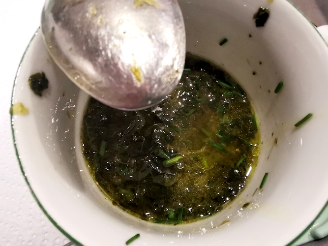 2- Dans la recette du chef, il faut du persil pour remplacer la ciboulette, ajouter du vinaigre de Xéres à la place du vinaigre de cidre, et ajouter de l’huile de noix en plus de l’huile d’olive !