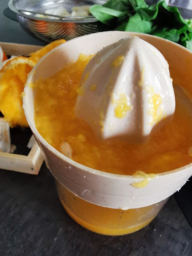 • Lorsque les asperges sont tendres, retirer le panier vapeur et verser la crème dans le jus d’orange.