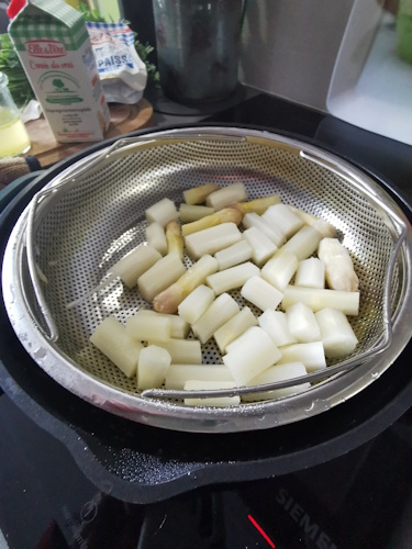 • Couper les asperges en tronçons et les mettre dans le panier du cuit vapeur.