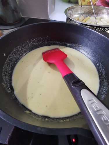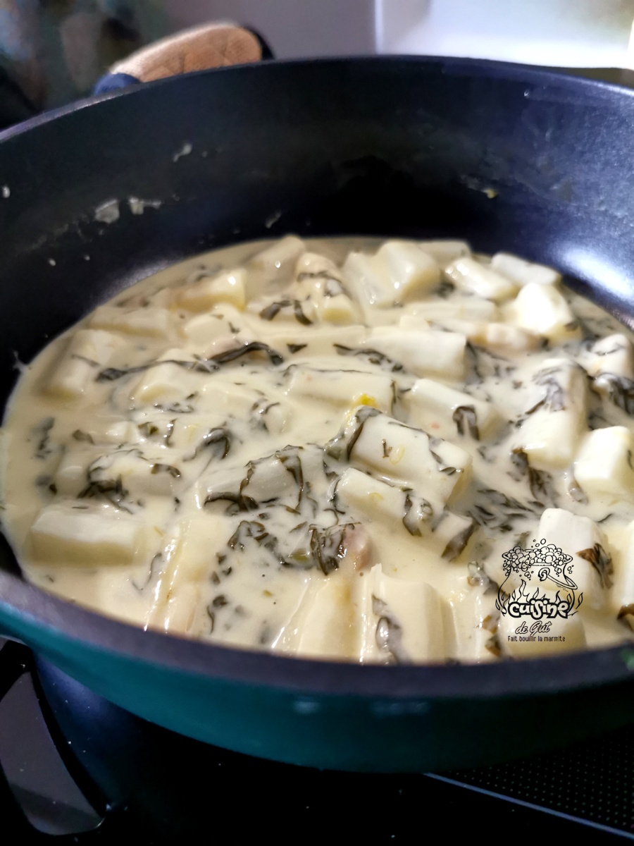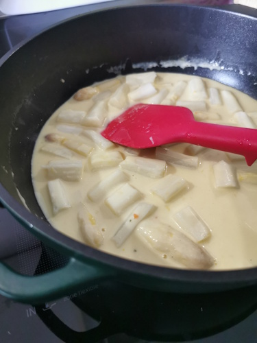 • Ajouter alors les asperges cuites dans la sauce. Saler (très peu) poivrer.