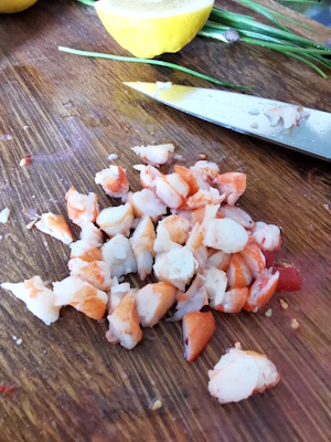 • Eplucher les crevettes et couper celles-ci en petits bouts.