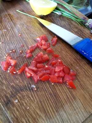 • Laver essuyer puis couper les tomates en minuscules petits morceaux après avoir retiré trognon et pépins.