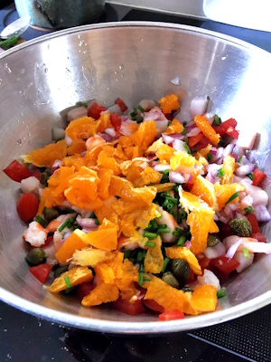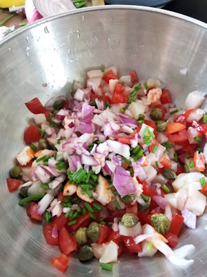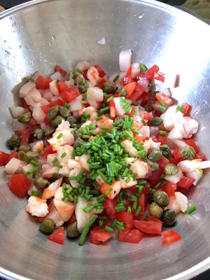 J’ai décidé d’y associer : l’Espadon, la noix de St-Jacques et la crevette, d’y ajouter simplement des petits morceaux de tomates. Puis, j’ai choisis volontairement de ne pas mettre d’huile d’olive mais de faire mariner ce tartare de façon légèrement acide, avec des câpres, un peu de citron, de l’oignon rouge, de la ciboulette, le tout adoucit par de la clémentine et voici ce que ça a donné…