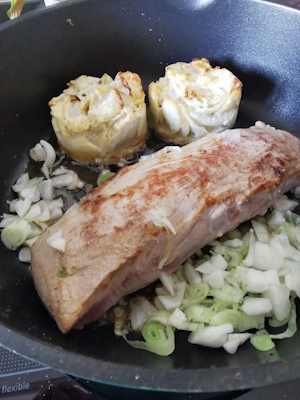 • A ce moment là, remettre le filet mignon au centre. Refermer la cocotte et poursuivre la cuisson 10 minutes.