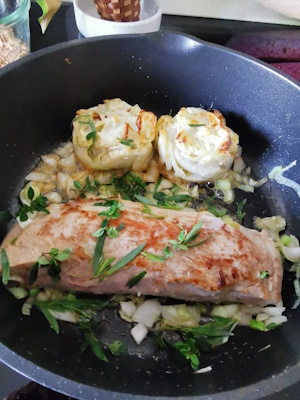 Une super surprise ce plat ! Le mélange des saveurs de l’estragon marié avec celle du Thym citron c’était une super idée car nous nous sommes vraiment régalés ! Les cardes qui n’ont pas vraiment de goût cuites à l’eau, mariées avec ces petites pommes de terre fondantes et à ces bonnes tomates bien plus goûteuses que celles qui arrivent du Maroc ont fait un bel accompagnement ! Comme j’ai eu raison de les congeler.