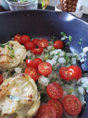 Comme je ne savais pas quoi faire comme accompagnement, j’ai fouillé dans mon congélo et j’ai ressorti des effeuillés de pommes de terre et le fond d’un sac de cardes de blettes que j’avais congelées. Un peu de tomates cerises Françaises (qui sont trop bonnes) pour compléter ça ferait l’affaire pour l’accompagnement !