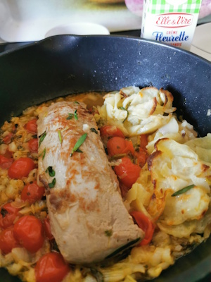 Bonjour !! Lorsque j’ai sorti ce filet mignon de mon frigo, je ne savais pas du tout comment j’allais le cuisiner. L’inspiration est venue au fur et à mesure. Ca m’arrive parfois. Il suffit d’une envie ou que je vois un ingrédient puis un autre et là ça se construit. Lors d’une petite virée à la jardinerie, je suis tombée il y a quelque temps sur un pot de thym citron ! Ce n’était pas ce que j’étais venue acheté mais je n’ai pas résisté. J’aime trop ça. L’envie de manger quelque chose avec ce thym m’a décidée je suis allée en cueillir et comme pas loin se trouve mon estragon j’en ai également cueilli de beaux brins. Voilà mon filet mignon serait aux herbes. En allant le chercher au frigo j’ai vu un bel oignon nouveau, je l’ai pris en me disant qu’il serait parfait pour faire ma sauce avec un peu de crème..