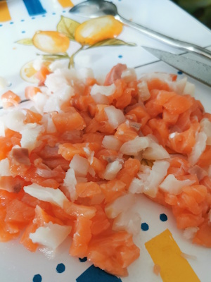 • Couper les poissons en fines lamelles puis les couper en morceaux. Les mettre mélangés dans un saladier.