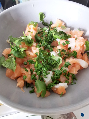 Je ne mange de tartare de poisson que depuis peu de temps, et le tien me plait avec cette pêche pour le parfumer.