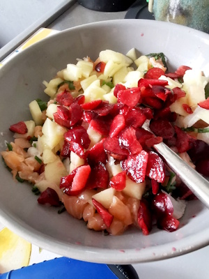 3. Lorsque c’est la saison je fais aussi souvent du tartare de saumon aux pêches et ton ajout de cerises renforce ce côté sucré que j’aime tant dans les plats salés ! Je suis moins généreuse en herbes que toi et j’adore ce trio d’herbes qui est surprenant. J’espère que tu as pu résoudre ton problème de fuite hier sans trop de désagrément. Je te souhaite une belle soirée Claudine, je t’embrasse